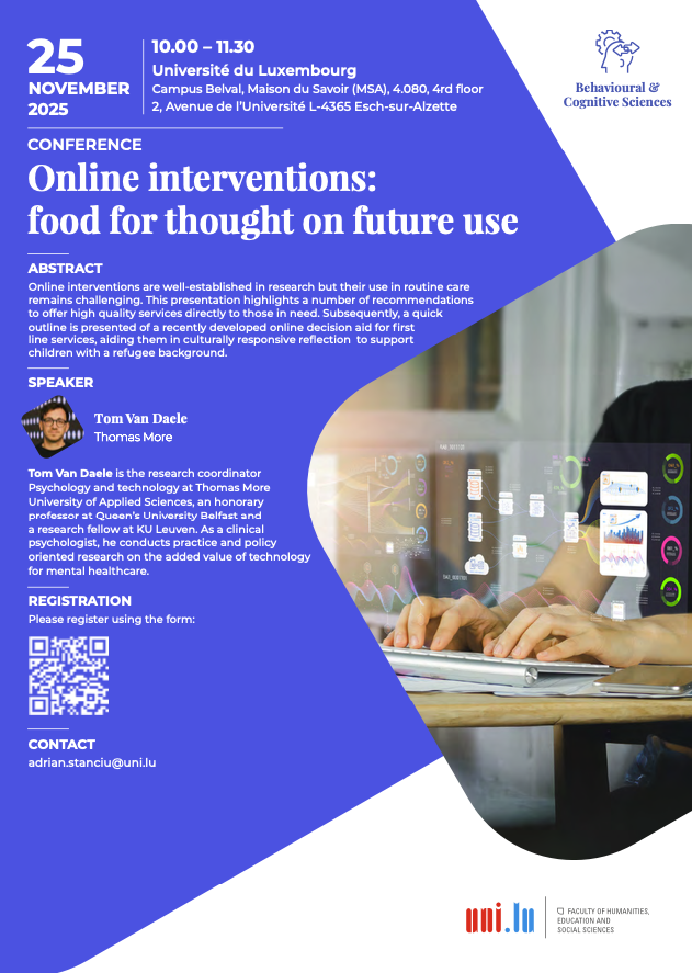 November, 2025 – Dr. Tom van Daele will visit our institute and give both a public lecture and a workshop focusing on best practices when developing and implementing online interventions.